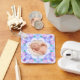 Soft Pretty Pastels Custom Christmas Photo Picture Key Ring. Jolly and Festive Pastels Purple, Green, and Pink Custom Christmas Photo Picture Frame Round Decoration. A soft colourful key organiser for your winter and purple and green multicolour themed home decorations. The frame design is a merry geometrical abstraction pattern take on traditional colour block festive designs. In pastel colours of lavender lilac with winter tree green, and pretty pink for a Winter Wonderland. Personalise it by replacing the two photos, on the front and back, with your own for an early keychain gift for family and friends to celebrate Christmas. The stock photo shows a baby sleeping. Cherish your Yuletide memories. A great gift for best friends and brothers and sisters, grandparents or couples. A budget friendly keepsake gift, for family celebrations or first Christmases.