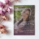 A memorial service invitation with your loved one's photo as the base, printed all over the card. A transparent color filter as an overlay gives the photo a softly muted look and helps the white text pop. There's also a soft purple gradient at the bottom to further make the text legible. Add another photo to the back. This invitation works well for funeral services, memorial services, life celebrations of mothers, sisters, daughters, grand-mothers, and wives, with the pretty feminine hand-writing script written across the side of the invitation that says in loving memory. This works best with a 1/2 body portrait taken from the waist up, so that the text frames your loved one's face.