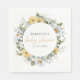 A Round frame of watercolor wild flowers, leaves, and daisies in soft watercolor palette of ivory white, sage green, yellow and orange adorn this romantic and gender neutral baby shower monogrammed napkins.
