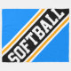This sporty design features athletic SOFTBALL text inside highlighted wide diagonal black, white, and golden yellow racing stripes against bright blue background. The first and last letters of the word "softball" run off the design edges with a dynamic banner effect.