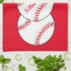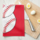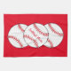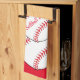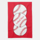 This kitchen towel features red and white softballs surrounded by a red background. The text reads: Softball Mum. Easily customise the text for a special sports fan or remove entirely. Great for Mother's Day or any time of year.
