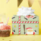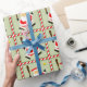 Creative softball Christmas holiday gift wrap featuring cartoon Santa fastpitch softball player at-bat.