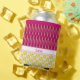Yellow softballs create a bright polka dot pattern on a pale pink background on both the front and the back of this fun can cooler for lovers of softball. On the front, softball bats are also used in a complementary pattern, and there is a white stripe for you to personalise with a name or other text.