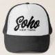 Soho New York trucker hat with script typography. Custom black and white baseball cap for casual wear, sports, golf and more. Stylish hand lettering design for men and women. Available in other cool colours too.