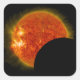 The dark shadow of the moon crosses in front of the sun during a solar eclipse captured in space and enhanced in this image.