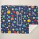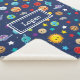 Celebrate the solar system with this cheerful outer space themed sherpa blanket. Blanket has a happy sun, happy planets (Mercury, Venus, Earth, Mars, Jupiter, Saturn, Uranus, and Neptune), as well as happy dwarf planet Pluto, asteroids, and stars. Personalise the blanket with your young space lover's first name.
