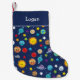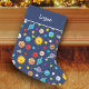 Celebrate the solar system with this cheerful custom outer space themed Christmas stocking. Stocking has a happy sun, happy planets (Mercury, Venus, Earth, Mars, Jupiter, Saturn, Uranus, and Neptune), as well as happy dwarf planet Pluto, asteroids, and stars. Personalise the stocking with your young space lover's first name.