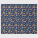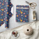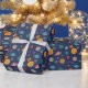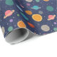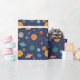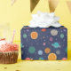 A fun and modern solar system pattern with colourful planet, star and sun illustrations against a dark blue background.