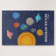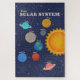 A colourful solar system illustration featuring 8 planets; Mercury, Earth, Venus, Neptune, Saturn, Uranus, Mars, Jupiter and the Sun against a starry, dark blue background. This modern design is both stylish and educational, great as decor & home schooling.