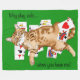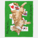 A cute orange tabby cat laying across a game of solitaire in a backdrop of green