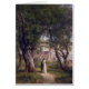 This is a beautiful depiction of a nun reading a book while taking a walk. She is surrounded by trees and a monastery is clearly visible in the background.