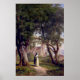 This is a beautiful depiction of a nun reading a book while taking a walk. She is surrounded by trees and a monastery is clearly visible in the background.