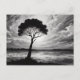 This dramatic black and white artwork showcases a lone tree standing defiant against a turbulent sky. The stark silhouette of the tree, its branches reaching towards the heavens, contrasts with the swirling clouds and dramatic lighting. The vast expanse of water reflects the sky's drama, creating a sense of depth and mystery. The artwork evokes feelings of solitude, strength, and resilience, reminding us of nature's enduring power.