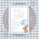 This charming 1st birthday party invitation features a cute little baby bunny holding balloons, and a blue gingham background. Designed by Thisisnotme©