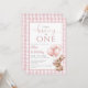 This charming 1st birthday party invitation features a cute little baby bunny holding balloons, and a pink gingham background. Designed by Thisisnotme©