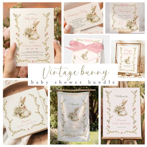 This vintage baby shower invitation design features a whimsical watercolor pink floral greenery frame and an adorable bunny girl. The beautiful ecru background colour serves for a vintage effect and complements perfectly the soft pink and green tones.