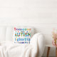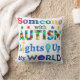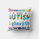 Inspirational quote of “Someone with AUTISM Lights Up My WORLD” with colourful Autism puzzles, a symbolic light bulb and lighting on the message to support autistic children and their families.