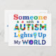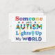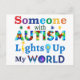Inspirational quote of “Someone with AUTISM Lights Up My WORLD” with colourful Autism puzzles, a symbolic light bulb and lighting on the message to support autistic children and their families.