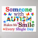 Inspirational Autism quote of “Someone With AUTISM Makes Me SMILE Every Single Day” with colorful Autism puzzles, beautiful flowers, and butterflies to support autistic children and their families.