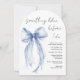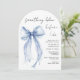 Chic arch-shaped bridal shower invitation featuring a light blue coquette bow watercolor, "something blu before I do" in a modern calligraphy script, and the bride's name name and shower details in simple lettering.