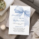 An elegant white background, decorated with blue bow. Personalise and add a name and party details.