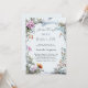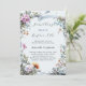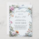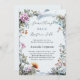 A soft light blue background, decorated witth pink and blue wildflowers and a blue ribbon. Personalise and add a name and party details.