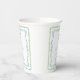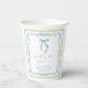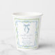 Elegant bridal shower paper cups featuring vintage grandmillenial-inspired green scallop and blue floral watercolor frames, a whimsical blue coquette bow watercolor, "something blue before I do" showcased in an elegant blue calligraphy script, and the name of the bride and shower date in classic serif typography.