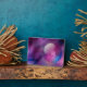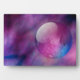 Against a backdrop of royal blue and intricate hot pink clouds like distant galaxies is a single smooth glass orb with a swirling fractal suspended inside.