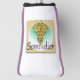 The original illustration by ZoeSPEAK on this Golf Putter Cover features a golden bunch of grapes. A gold pin like this is worn by a sommelier. A sommelier, or wine steward, is a trained and knowledgeable wine professional who specialises in all aspects of wine service as well as wine and food pairing. In this illustration, the grapes light up the deep purple letters "sommelier", like sunshine in the vineyards. A round green shape echoes the wine bottle and the greens and deep reds of the vineyard. A cork textured background with a rough edge surrounds the scene.