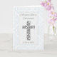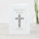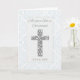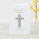 A beautiful card to celebrate the Christening of a baby boy, featuring an elegant raised-look cross with a swirling white-on-silver pattern, framed by soft blue scrollwork. The front reads “As your Son is Christened” and includes space below the cross for a custom date, making it a meaningful keepsake. Perfect for sharing blessings on this important day of faith and family.