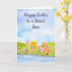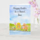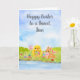 Bright spring colors and playful charm fill this watercolor Easter card, featuring a fluffy baby chick carrying a basket of colorful Easter eggs while a friendly bunny wearing a pink bowtie keeps watch nearby. Set among blooming pastel tulips, the scene captures the excitement and fresh spirit of the season. Thoughtfully created as a special Easter greeting for your son, this cheerful design sends warm wishes, smiles, and joyful holiday fun.