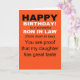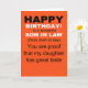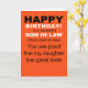 Son in law proves daughter's good taste, says the front of this funny birthday card. The card was made with a mother in law in mind who wishes tease her daughter's husband as he celebrates growing older by one year. The cute message on the inside parlays the sweet compliment on the front into a sneaky, but shockingly humourous jacktation that will make the daughter's husband laugh out loud.