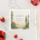 Personalised wedding napkins with Christian inspirational quote scripture depicts a casual nature watercolor design including a simple stream of water surrounded by forest pine trees and mountains in earth tone shades of sage, green and tan. It features Bible Verse Song of Solomon 6:3, "I am my beloved's and my beloved is mine." Customise the plates with names and date.