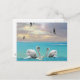 Featured is a White swan family and flying swans in a pretty seaside setting