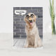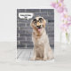Golden retriever wearing a funny mustache mask on gray brick wall and wood floor with speech bubble for Son's birthday.