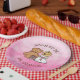 Country and western themed rustic girl's baby shower paper plates. Graphics are a cute little baby girl in a cowboy hat sitting next to a teddy bear. Pink background. Baby Shower paper plates.