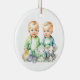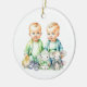 Birth or Pregnancy announcement. Cute blue and green themed Christmas ornament with two twins in blue and green. Twin boys announcement. Personalised the due date on the back.