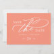 This romantic coral wedding save the date card from the Sophia Collection features sweeping white calligraphy. The soft pinkish peach background, airy flourishes, and timeless typography are perfect for a fun classic-meets-modern wedding.