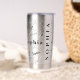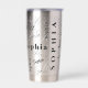 A custom name tumbler showcasing "Sophia" in multiple styles over a background script blue initial "S". The black, blue, and silver colours offer a sophisticated look, ensuring your drink remains yours with the prominently displayed names.