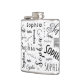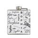 A typography custom name flask for Sophia's favourite drink.. The initial script "S" makes a decorative pattern in the background. Her name features a mixture of fun lettering and striking contrasting colours of black, white and grey. This personalised makes a great gift choice for any occasion that calls for high spirits.