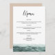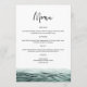 This menu features a teal ocean watercolor graphic and edgy handwritten brush font. Use this template to edit the fonts, font colour, and background colour to match your event needs. Pair with additional items from the SOPHIA Collection for a cohesive look.