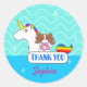 These stickers feature an illustration of Sophie, a dog cartoon character, relaxing on her rainbow unicorn shaped inflatable pool float. Sophie is a brown and white dog that is wearing a pineapple bathing suit. The sticker has wavy line design and sparkle accent. "Thank You" is in a balloon shaped font, and the signature portion for the name is in pink.