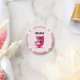 These poker chips have two sophisticated cats one black, one white sitting in a mid century pink chair on a white background with pink dots.