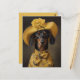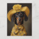 Elegant chic Dachshund in the style of the Dutch painter Frans Hals. Cute dog wearing a yellow dress and hat with yellow flowers