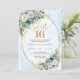 Perfect for elegant, modern, or garden-inspired parties, the harmonious mix of dusty blue, white florals, and greenery creates a timeless look that feels both youthful and upscale. The gold frame adds a subtle touch of glamour, making this design ideal for formal Sweet Sixteen events, evening celebrations, or classy birthday themes. The balanced layout ensures party details are easy to read while maintaining a polished, photo-worthy presentation.