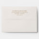 This wedding envelope features a minimalist design with centered text on an off-white background, creating a clean and elegant look. The muted gold color palette adds a touch of sophistication without overwhelming the simple layout. Utilizing digital typography, the design employs a serif font for names and a sans-serif font for addresses, ensuring clarity and readability. The generous spacing between elements enhances the understated elegance, making it perfect for couples seeking a refined and modern aesthetic for their special day.