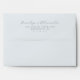 This wedding envelope features a minimalist design with a clean, white background that highlights its elegant cursive script for names at the top. The layout is centred and balanced, creating a sophisticated look with customisable address details in a crisp sans-serif font below. The soft grey colour palette adds a touch of subtle sophistication, making it perfect for formal occasions. Its modern and understated style ensures versatility, ideal for couples seeking a timeless and polished presentation for their special day.