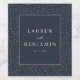 This elegant wedding wine label features a sophisticated navy blue background adorned with a subtle grid of white dots, creating a refined border. The design showcases centred text in an elegant serif font, allowing for customisable names and dates to be displayed prominently. Its minimalist style emphasises clarity and balance, making it perfect for celebrating your special day with a touch of timeless charm. Ideal for weddings, this label adds a formal yet understated aesthetic to any bottle, capturing the joyous occasion beautifully.