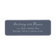 This return address label features a sophisticated and elegant design with a deep navy blue background that contrasts beautifully with the crisp white text. The layout is minimalistic, focusing on centered typography that combines a flowing script font for personalization with a clean serif font for clarity. Perfect for formal events or special occasions, this label exudes a timeless charm with its classic color palette and refined typeface, ensuring your correspondence stands out with an air of sophistication.