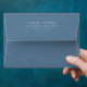 This wedding envelope features a minimalist design with a solid blue background and crisp, centered white text. The layout is clean and elegant, utilizing ample negative space to highlight the typography, which includes a classic serif font for a timeless look. Perfectly balanced, this design conveys sophistication and simplicity, making it ideal for formal occasions like weddings. Its understated style ensures that your special details stand out without distraction.